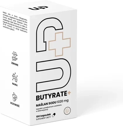 UP BUTYRATE+ to suplement diety zawierający maślan sodu, standaryzowany na 78% kwasu masłowego – związku naturalnie wytwarzanego przez bakterie jelitowe. Produkt wspiera funkcjonowanie przewodu pokarmowego, w szczególności regenerację błony śluzowej jelit oraz równowagę mikrobioty.